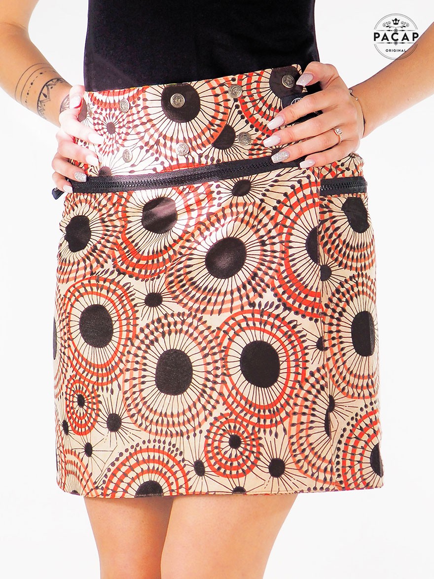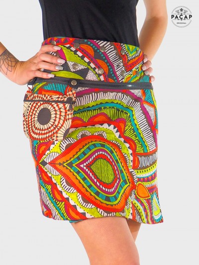 It is a real fashion accessory, which will put light in your look. With its zipper, its 2 different prints on the front and back and its reversible snap pocket, by buying a skirt, you get 8 different skirts! First side: ethnic print type African wax, very colorful.