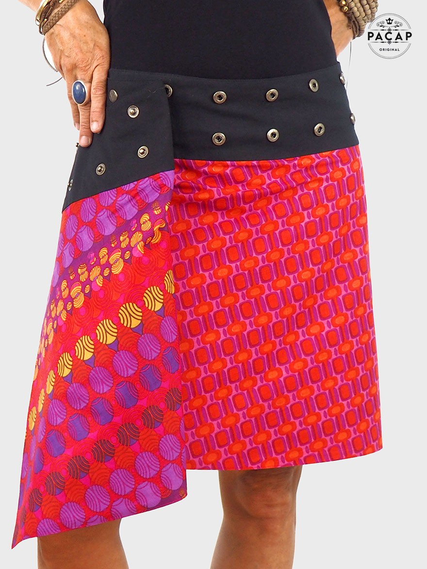 Wrap skirt 2 in 1 Flava is a combination of ethnic geometric and Aborigines prints colored on a fushia pink background, adjustable size from 34 to 46 thanks to its snaps.