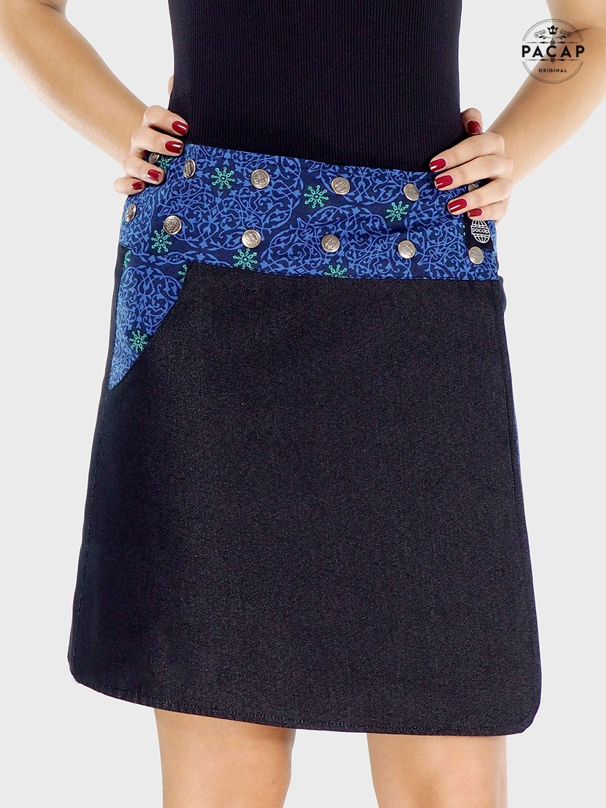 Depending on your morphology, wear this multicoloured skirt " reversible coton/jeans in high or low size.